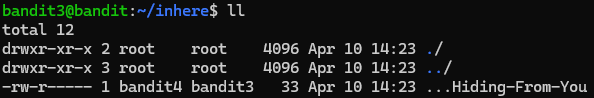 이번 문제는 “inhere” 라는 디렉터리에 히든 파일로 저장되어 있다고 한다.