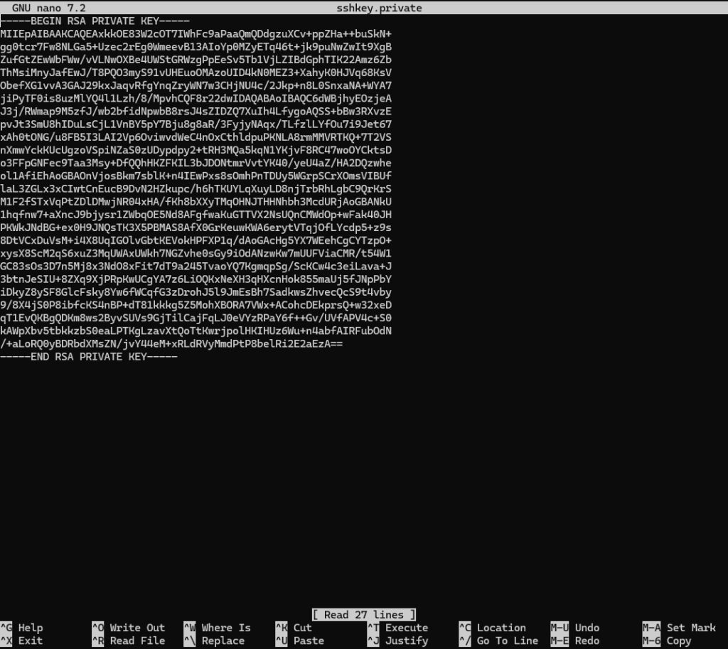 우선 개인키 파일의 내용을 복사한다. 리눅스에서 nano 편집기로 키를 저장한다. 그리고 해당 키 파일의 권한을 소유자만 사용하게 바꾼다.
