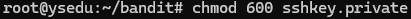 홈 디렉터리에 개인키 파일이 있다. 이 파일을 ssh 커맨드의 -i 옵션으로 bandit14에 로그인 할 것이다. 그런데 개인키 파일을 이용해 로그인 하려면 해당 파일의 권한은 소유자만 읽을 수 있어야 한다. Windows는 권한 설정이 귀찮으니 리눅스에서 진행한다.