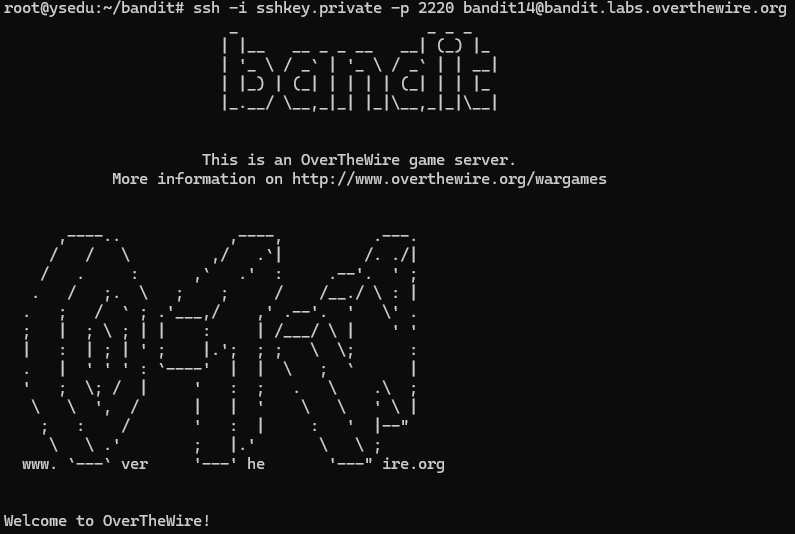 해당 파일을 사용하여 ssh 커맨드의 -i 옵션으로 bandit14에 로그인한다.