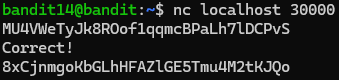 bandit14의 크리덴셜을 확보했으니 localhost의 30000번 포트로 접속한다. 이번엔 원격 접속이 아닌 단순 접속이므로 nc를 이용한다. nc(netcat)는 TCP와 UDP로 connect 또는 listen을 하는 명령어이다.