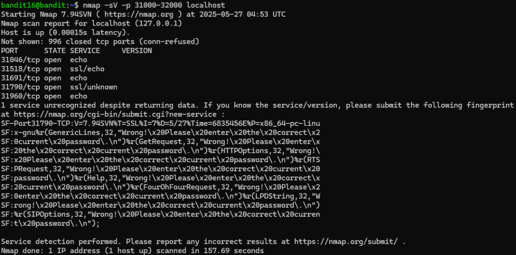 이번엔 SSL/TLS 통신으로 로컬호스트의 31000~32000번 포트에 연결하고 bandit16의 패스워드를 제출하면 된다.