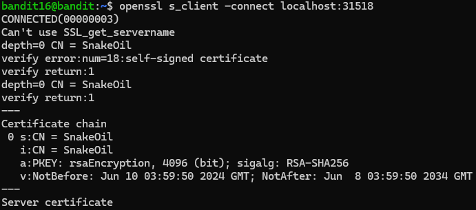 31518과 31790 포트가 ssl 서비스로 열려있기 때문에 해당 포트로 openssl s_client 커맨드를 사용하여 연결을 시도한다. 연결되면 bandit16 계정의 패스워드를 제출한다.