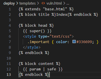 그래도 /vuln 페이지에 HTML 파일을 보면 safe 필터가 있다. 이는 HTML 태그를 허용해주는 옵션이다. 이 설정이 없으면 “<” 기호는 “<“로, “>“기호는 “>“으로 바뀌기 때문에 XSS로부터 안전하다. 설정을 했기에 취약한 것이다.