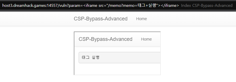 왜 위험한지 예시를 보여주겠다. “/vuln 페이지에 safe 필터 설정으로 HTML 태그를 사용할 수 있다.” 아래 사진과 같이 HTML 태그를 사용할 수 있으니 iframe으로 창을 하나 더 만들어서 /memo 페이지를 보여주는 예시이다. safe 필터가 없었다면 화면에 단지 <iframe src="/memo?memo=태그 실행"></iframe> 만 출력했을 것이다.