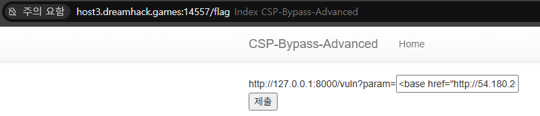 이제 워게임 서버의 /flag 페이지에 아래의 코드를 삽입하면 된다. <base> 태그를 이용해 상대 경로의 기준을 내 서버로 설정하는 코드다.