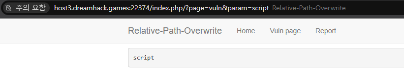 그래서 경로를 조작하여 요청할 경우, 원래는 “script” 문자열이 존재하면 param 파라미터에 “nope !!” 문자열을 저장하여 텍스트 박스 안에 “nope !!”이 출력되어야 하나, 아래와 같이 “script”를 출력할 수 있다.