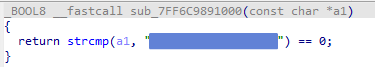 아규먼트로 넘겨준 v4를 sub_7FF6C9891000 함수에서 a1 파라미터로 받아서 사용한다. strcmp 문자열 비교 함수로 입력받은 a1과 플래그를 비교하여 이 둘이 완전히 같다면 0을 반환한다.