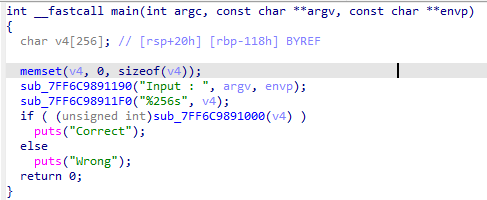 sub_7FF6C9891000은 입렫받은 v4를 비교하여 참이면 “Correct”를 출력한다.