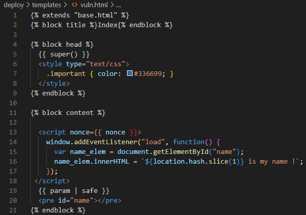 vuln.html의 소스 코드를 살펴보면, param으로 받은 값을 템플릿을 통해 html 화면에 출력하고, “name” 아이디의 객체에 innerHTML을 사용해서 해시(#)에 들어온 값을 삽입하고 있다. 이 부분에서 취약점이 발생한다.