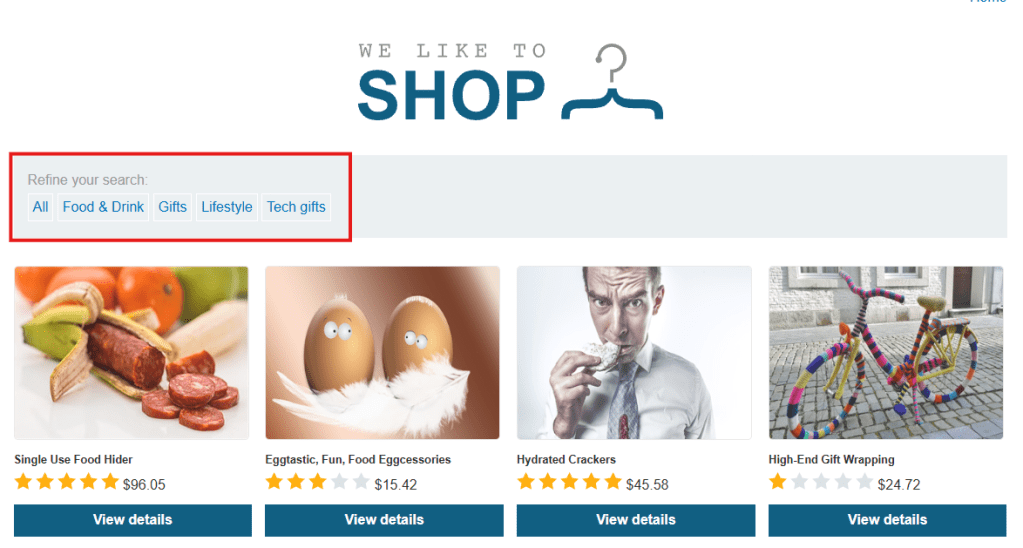 카테고리를 클릭하면 URL에 쿼리스트링으로 ?category={ }가 추가된다. 품목도 Gifts 카테고리만 출력된다. 해당 값을 항상 참이 되게 설정하면 모든 상품을 볼 수 있다.
