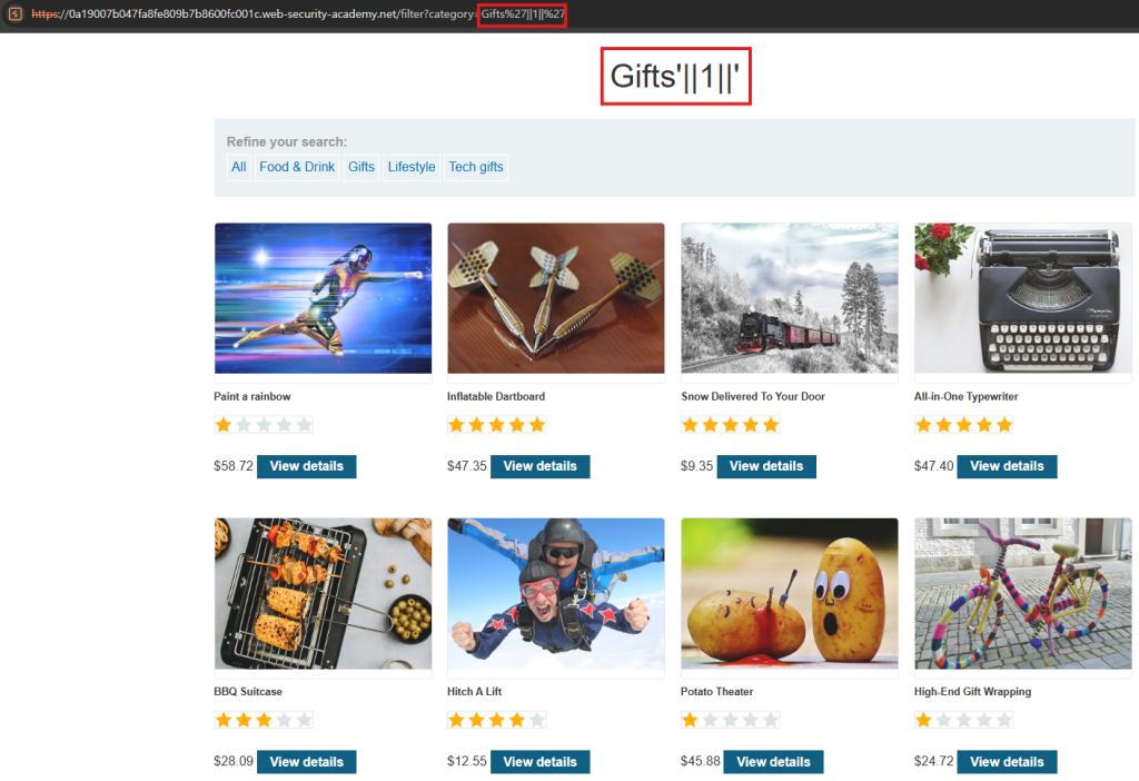 OR를 사용해서 항상 참이 되도록 할 수 있다. ?category=Gifts’||1||’ 을 입력하게 되면, Gifts 또는 1 또는 공백이므로 모든 것을 출력하게 된다. 이러면 아무런 카테고리가 지정되지 않았던 첫 화면보다 더 많은 상품들을 출력해준다.