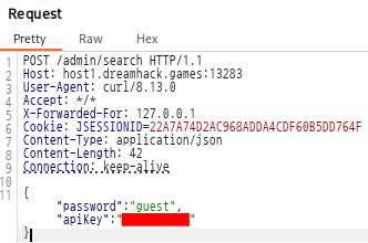 소스 코드를 보면 /admin/search는 API-Key의 끝부분이 일치하면 참이 되므로, API-Key를 한 글자 씩 추출이 가능하다.