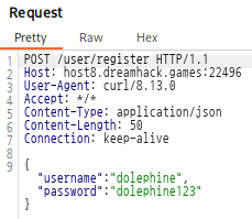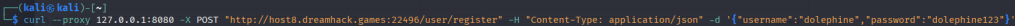 curl --proxy 127.0.0.1:8080 -X POST "http://host8.dreamhack.games:22496/user/register" -H "Content-Type: application/json" -d '{"username":"dolephine","password":"dolephine123"}'