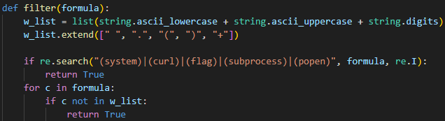 - formula 파라미터에 사용자 입력 값을 전달하여 python 표현식을 실행해 flag.txt 파일을 읽으면 되므로 open(‘flag.txt’).read()를 전달하는 것을 목표로 한다.