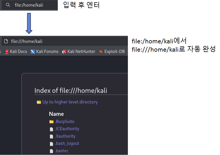 - 웹 브라우저에 “file://”으로 scheme을 완성하지 않아도 내부 파일에 접근이 가능하다. 아래의 이미지와 같이 “file:/home/kali”를 전달하면, 내부에서는 “file:///home/kali”로 자동 완성이 되고, 정상적으로 페이지를 불러온다. 문제의 url 파라미터는 입력 값에서만 검사하기 때문에, 입력 값을 “file:“로 하면 해당 필터링을 우회할 수 있다.
