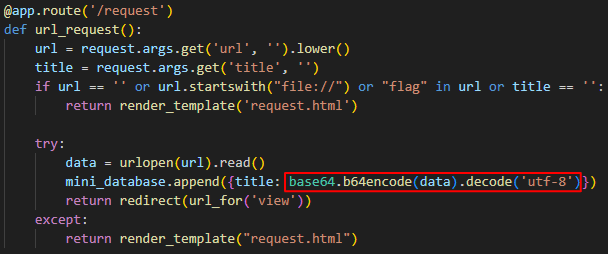 - [/request]에서 브라우저를 통해 내부 파일을 업로드할 수 없도록 url 파라미터의 입력 값이 “file://”으로 시작되거나 “flag” 문자열이 포함되면 업로드를 하지 않도록 필터링한다.