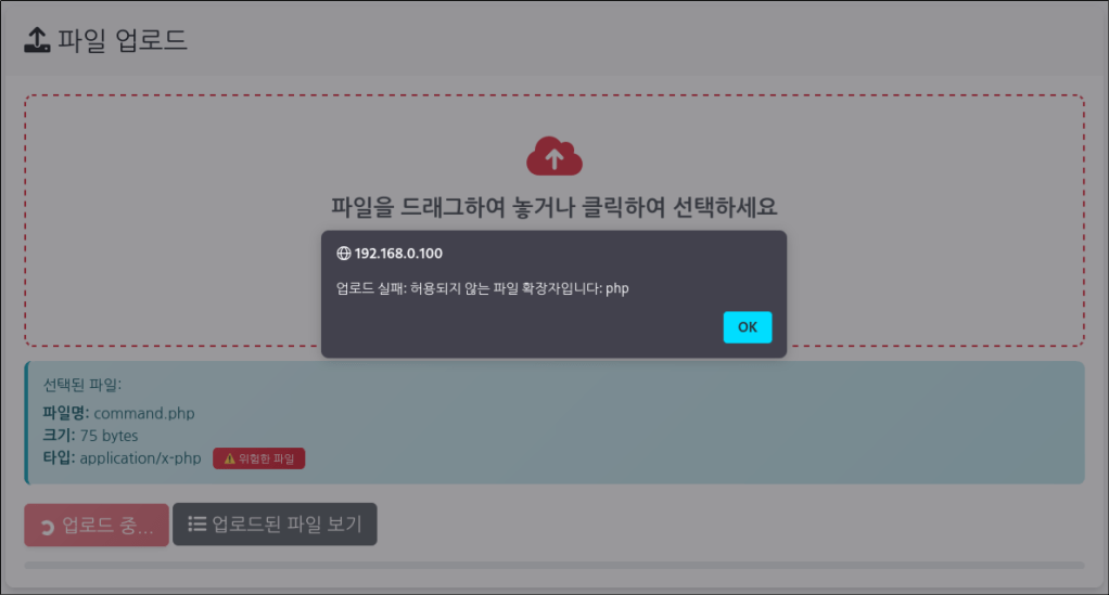 파일 확장자를 검증하는 코드를 추가하여 .php 확장자는 차단하는 것을 확인할 수 있다.