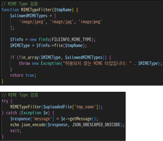 MIME Type을 검증하는 함수를 추가한다. 그리고 해당 함수를 파일 업로드 코드에 적용시킨다.