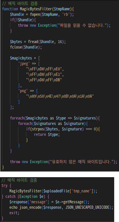 매직 바이트를 검증하고 [jpeg, jpg, png]가 아니면 차단하는 함수를 작성한다. 그리고 파일 업로드 코드에 적용한다. jpeg와 jpg는 같은 매직 바이트를 사용한다.