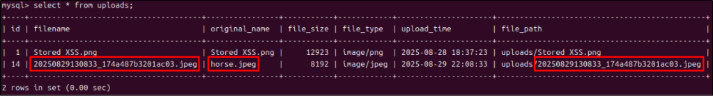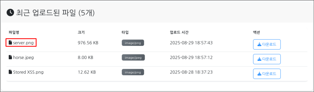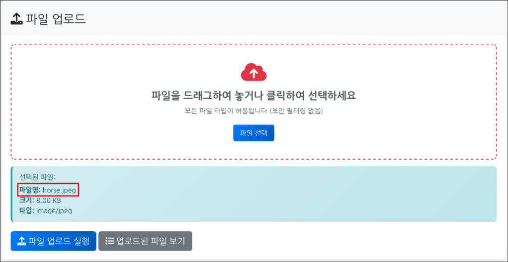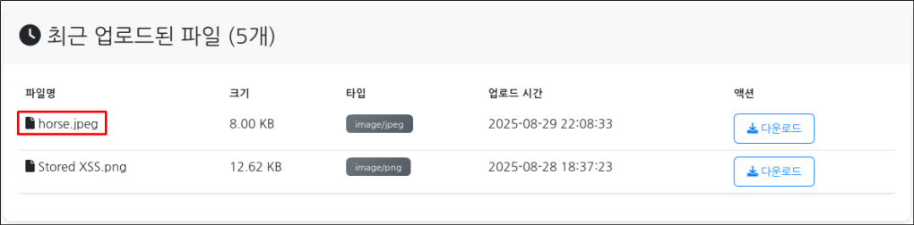 [horse.jpeg] 파일을 업로드를 하면, 웹 페이지의 파일 목록에는 [horse.jpeg]로 출력되지만, 서버의 데이터베이스와 uploads 디렉터리를 확인하면 유추할 수 없는 파일명으로 변경되어 저장된 것을 볼 수 있다. 공격자는 파일 업로드에 성공하더라도 저장된 파일명을 알 수 없어 접근이 거의 불가능 해진다. (우연히 파일명을 맞출 수 있는 가능성이 존재하긴 한다.)