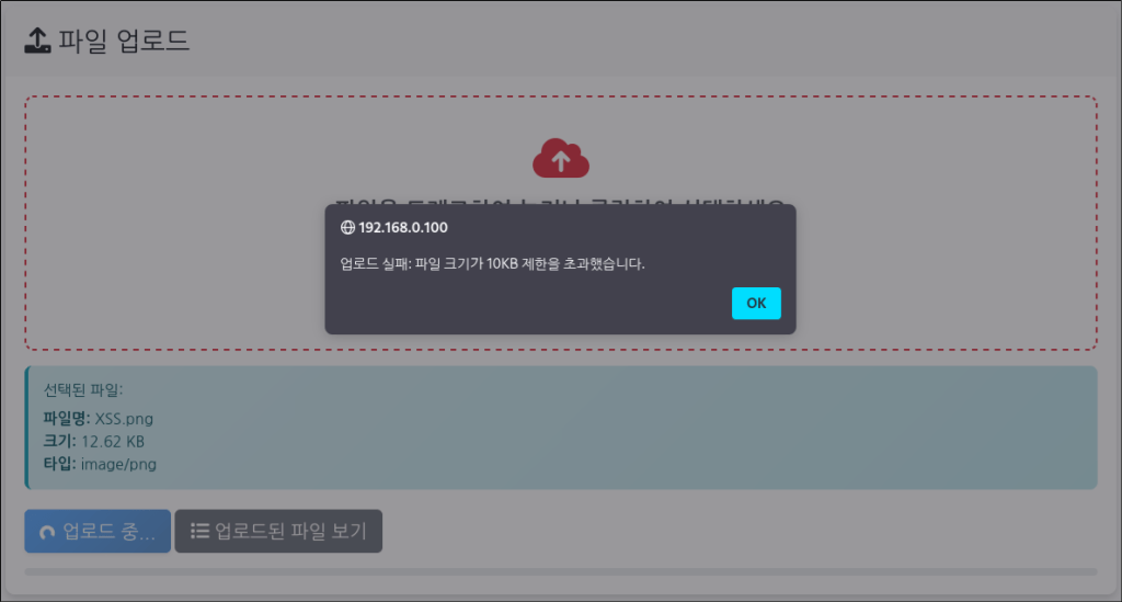 업로드하는 파일의 크기를 10KB로 제한한다. 이를 넘을 경우 차단하고, 에러 메시지를 전송한다.