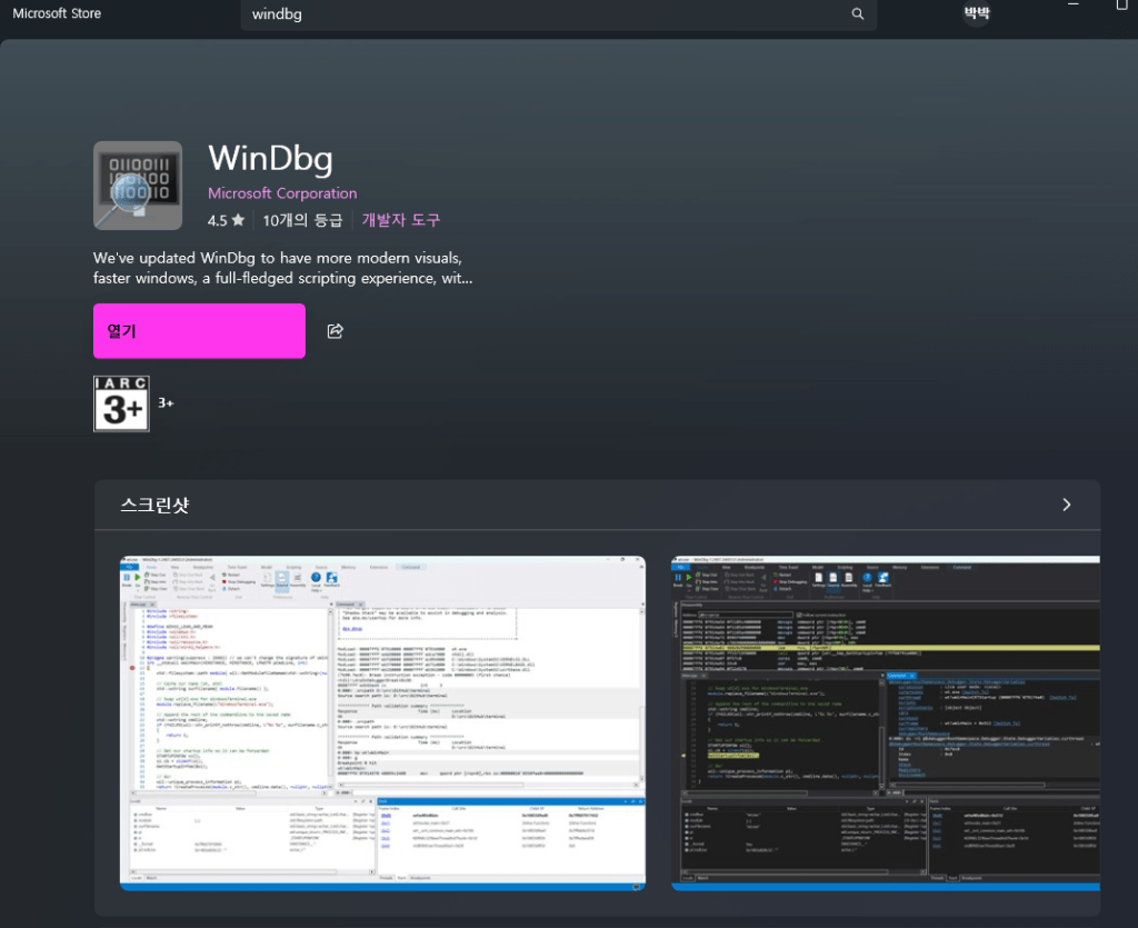 Windows의 공식 앱 Microsoft Store에서 다운로드가 가능하다. “WinDbg”를 검색하여 설치를 진행하면 된다.